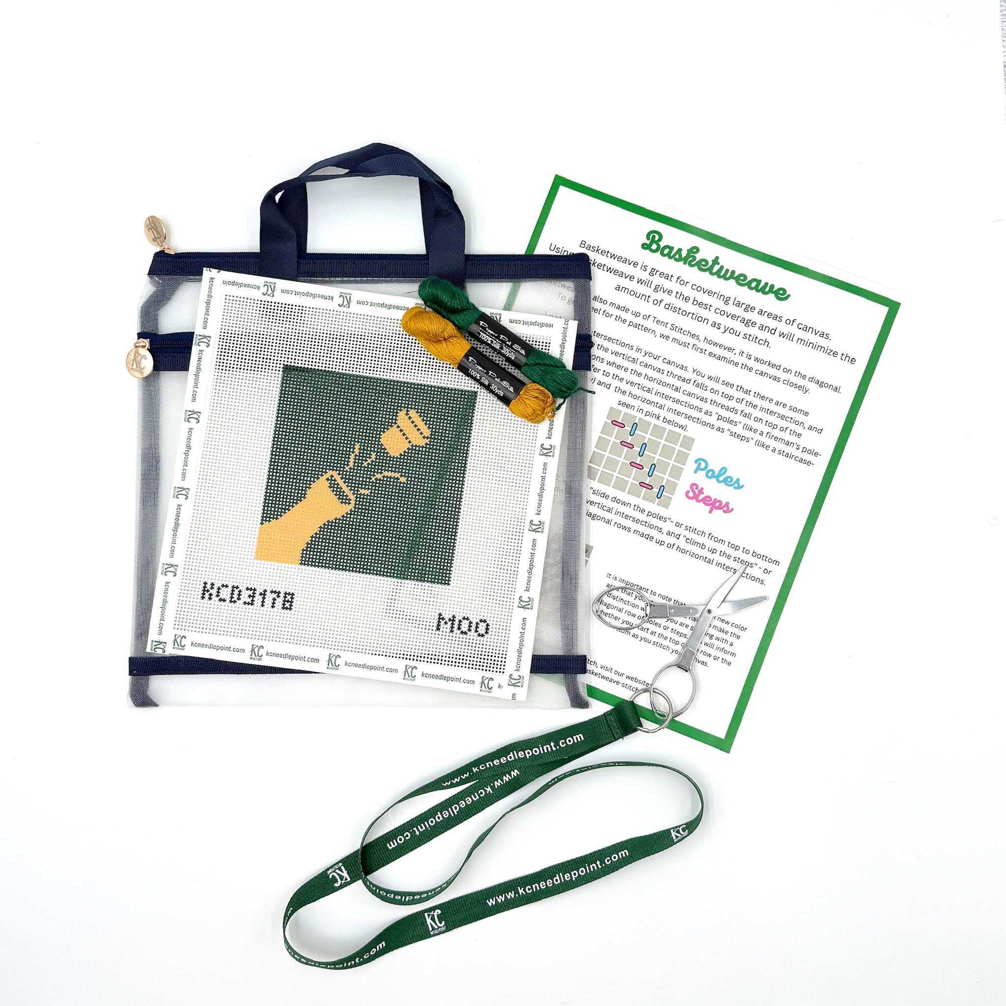 This Beginner Kit contains a design on 13 mesh mono deluxe canvas, two skeins of 100% silk thread, one Size 20 John James Tapestry Needle, a mesh project bag, folding scissors on a lanyard and a beginner instruction sheet. The design area is a 4 1/4" square. This kit is the perfect gift for the new needlepointer!