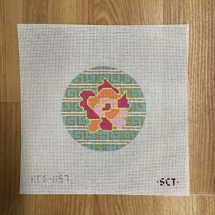 Pink Flower on Blue and Gold Needlepoint Ornament Canvas